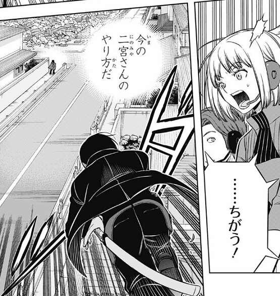 二宮は両攻撃(フルアタック)で攻撃しようとしていたので、ガード出来ないと三雲は読んでいましたが、二宮は三雲の攻撃を読んでいて移動する事で三雲の攻撃を避けます。解説席の王子は三雲に弾を散らして撃てるくらいの、射手としての経験があれば…、と残念に思います。