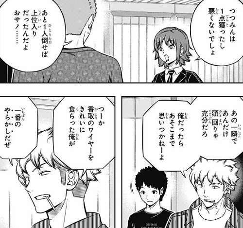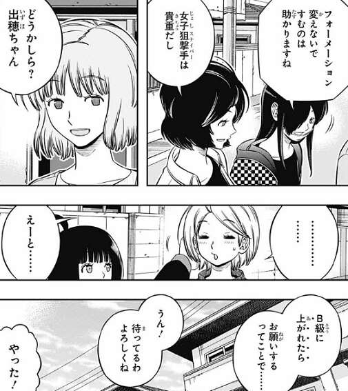 日浦から、出穂ちゃんは絶対強くなりますよ!当真先輩もそう言ってたし、と夏目を推しますが、夏目本人はただのC級っすよ!?と遠慮します。しかし、日浦から意見を聞かれた雨取も夏目に出来ると思うと言い、他の那須隊も夏目を歓迎します。夏目も照れながら、B級に上がれたらお願いします、と言い夏目は那須隊に内定します。