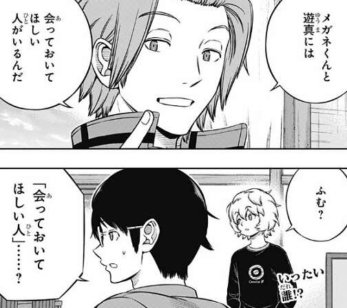 場面変わって、玉狛支部では空閑と三雲が遠征選抜試験について話していると、メガネくんと遊真には、会っておいてほしい人がいるんだ、と迅から言われます。