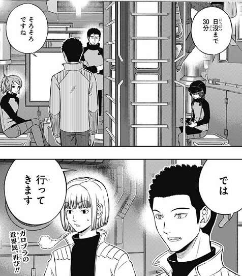 迅から会っておいてほしい人がいるんだ、と言われ玉狛支部に来ると、陽太郎の姉、忍田瑠花を紹介されます。陽太郎の姉なのに苗字が忍田だったり、唯我先輩に通じるものがあるぐらい尊大な態度だったり、ボーダーが大きくなったことに関係していたりと、色々と訳ありの人のようです。てっきり瑠花が迅の言う、会っておいてほしい人だと三雲は思いますが、別にいるようです。そしてこのタイミングでガロプラが再登場ということで、どうやらガロプラが会わせたい人、と思われます。