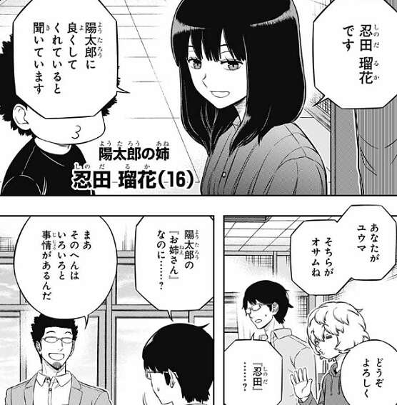瑠花は三雲と空閑の事は知っていて挨拶してきますが、三雲は瑠花の苗字が忍田というところに引っ掛かります。陽太郎の姉なら、陽太郎と同じ苗字の林藤になるはずですが、そのへんはいろいろと事情があるようです。
