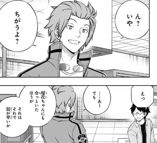 そこに迅が現れて瑠花はもう来てるか、三雲に聞いてきます。三雲は、迅が『会わせたい人』とは、瑠花のことだったのか質問すると、ちがうよと迅から返事がきます。『会わせたい人』には、今から会いに行くから三雲は普段着のままトリオン体に換装しといて、と三雲に言います。