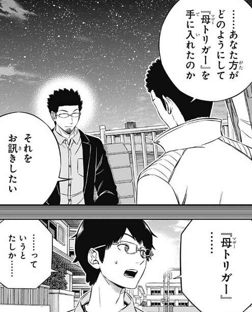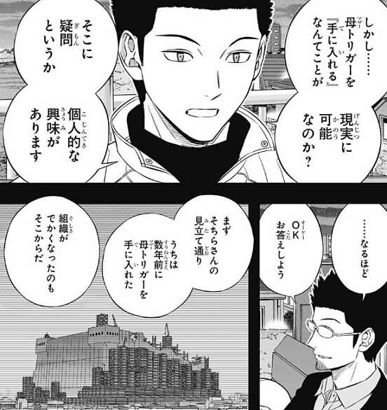 ガロプラは前回の攻撃時に、格納庫の更に地下深くにとても大きなトリオン反応に気付いていて、それが母(マザー)トリガーではないかと推測しています。ミデンの著しい成長は母(マザー)トリガーを手に入れたことに起因するのではないか、しかし母(マザー)トリガーを手に入れるなんてことが、現実に可能なのか、そこにラタは個人的な興味があると言います。すると林藤支部長はあっさりと、数年前に母(マザー)トリガーを手に入れたことを明かします。