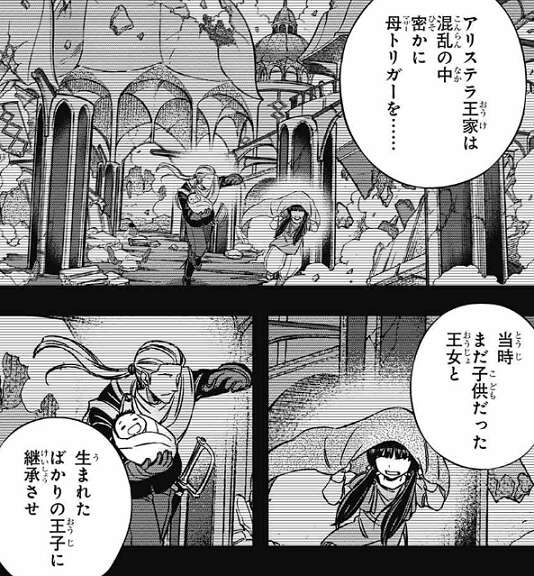しかし、ボーダーはそれ以前もこっそり活動をしていて、当時作ったボーダーの組織のエンブレムにはそっちの世界にある3つの同盟国を表してる、と林藤支部長は言います。その3つの同盟国とは、デクシア、メソン、アリステラです。その中のアリステラは5年と少し前の戦いで滅び、アリステラ王家が代々管理する母(マザー)トリガーもそこで失われるはずでした。しかしアリステラ王家は、当時まだ子供だった王女と生まれたばかりの王子に、密かに母(マザー)トリガーを継承させていました。
