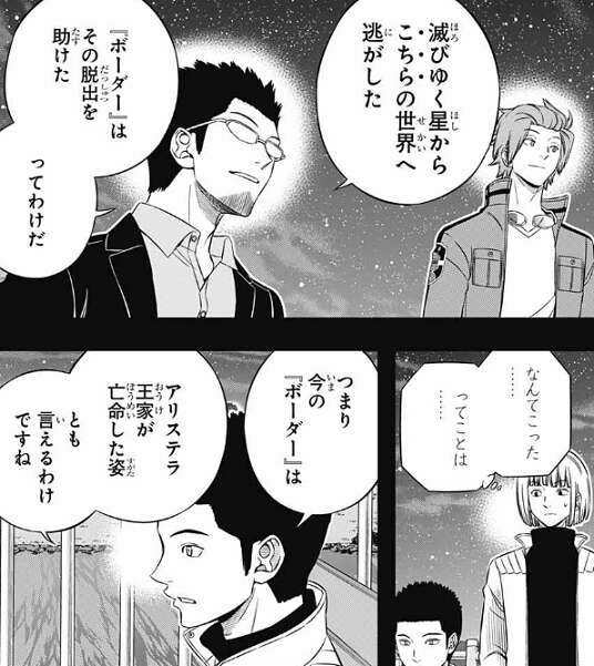 そして滅びゆく星からこちらの世界へ逃がし、ボーダーはその脱出を助けた、と林藤支部長は言います。今のボーダーはアリステラ王家が亡命した姿でもあり、だからアリステラの母(マザー)トリガーを、ボーダーが動かすことも出来ています。