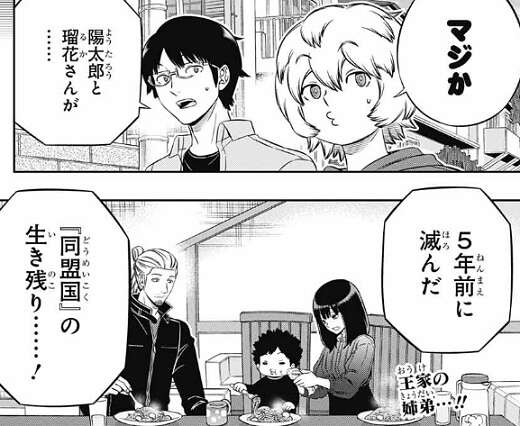 そして、当時赤ん坊だったアリステラの王子が陽太郎だと、林藤支部長はガロプラに伝えます。瑠花と陽太郎が5年前に滅んだ同盟国の王女と王子と知り、三雲と空閑は驚きます。