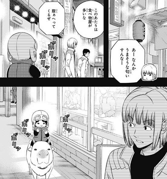 夜の街を歩きながらレギーは、このまま何もミデンの動きをジャマできずに終わったら、アフトクラトルの方から何言われるかわかったもんじゃねーぜ、と今後ガトリン隊長がどうするかを気にしています。ラタとレギーが夜の街の食べ物の匂いを気にしていると、陽太郎が二人を見つけます。