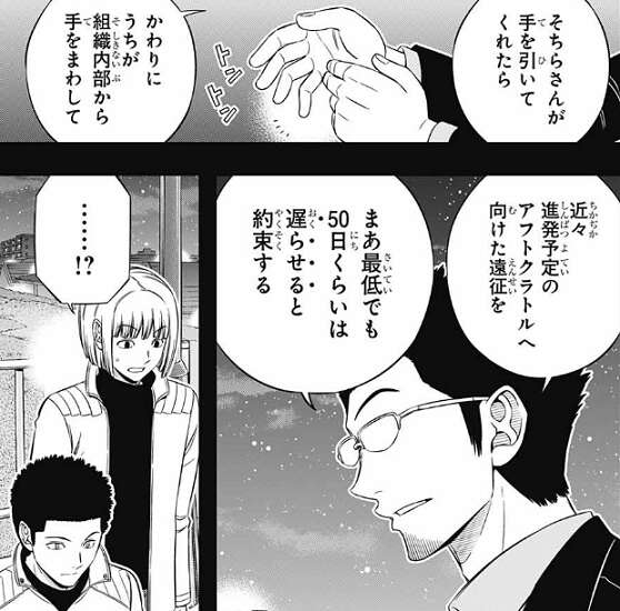 しかし、穏便な作戦が失敗するとガロプラが手詰まりになって、最終手段として街を襲う可能性もあり、林藤支部長は『取引』としてミデンの遠征を妨害する事から手を引いてくれたら、アフトクラトルへの遠征を50日くらいは遅らせると言います。