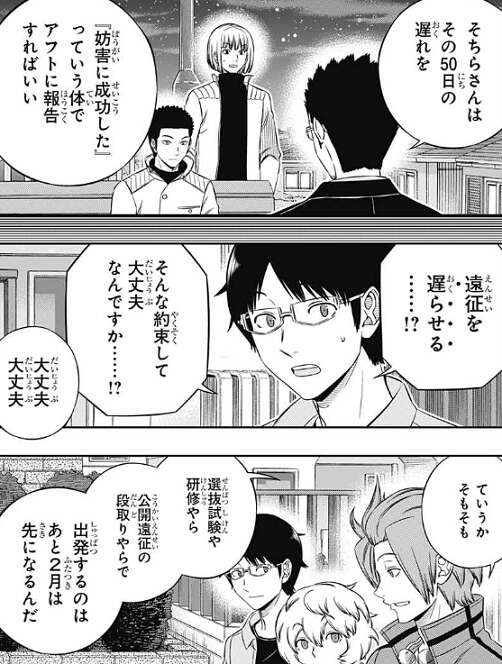 50日の遅れを妨害に成功したという体で、アフトクラトルに報告すればいいと林藤支部長はガロプラに提案します。実際は、元々準備で2月は先になるのでボーダー内として50日くらい後になるのは予定通りですが、ガロプラやアフトクラトルは知らないので、それを50日くらい遅らせたことにしています。しかし、ラタはガロプラにとっては何もしないでも目標が達成できるので、こちらにとって都合が良すぎると警戒します。