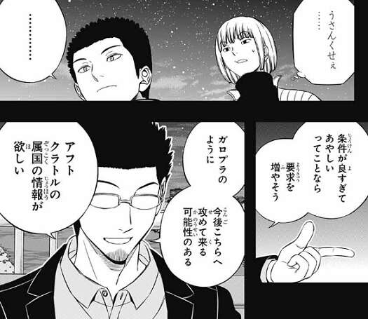 玉狛支部はできるだけそちらの世界と仲良くしていきたいという考えだと、林藤支部長は伝えますが、レギーはうさんくさいと感じます。それを感じたのか林藤支部長は、条件が良すぎてあやしいなら要求を増やすと、アフトクラトルの属国の情報が欲しいとガロプラに言います。
