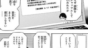 諏訪からどうする?と聞かれ、三雲は、なんとかします、と言うと考え始めます。そして、隠岐のパソコンの画面に映っている共通課題の問題文を、三雲は通信デバイスについているカメラで映し始めます。問題文をカメラで映して今日のうちに手書きで問題を解き、明日のあさイチでパソコンに解答を打ち込み、これで遅れをある程度取り戻す、と三雲は対応策を説明します。それを聞いて宇井も、7時過ぎても課題を進められると、カメラで問題文を撮ろうとします。香取は7時を過ぎて課題をするのは嫌のようで、えぇ~……?と、声を漏らします。結局、若村が臨時隊長に選ばれた理由は有耶無耶になり、特別課題の意見をまとめることになります。