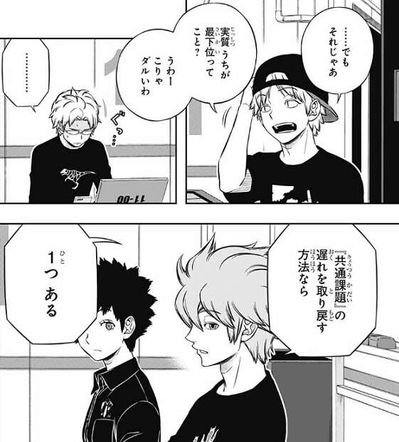 さらにヒュースは、三雲のチームの点数が低いのは三雲かオペレーターのトリオンが切れて、途中から課題が出来なかったあたりの理由だろう、と分析します。それを聞いて半崎が、実質うちが最下位ってこと?と、言い若村は落ち込みますが、ヒュースは『共通課題』の遅れを取り戻す方法なら、一つあると言います。