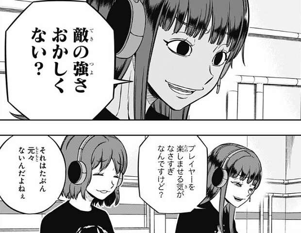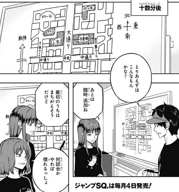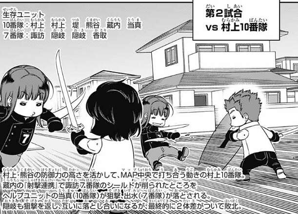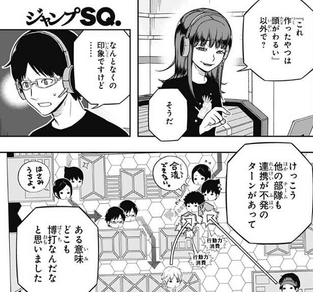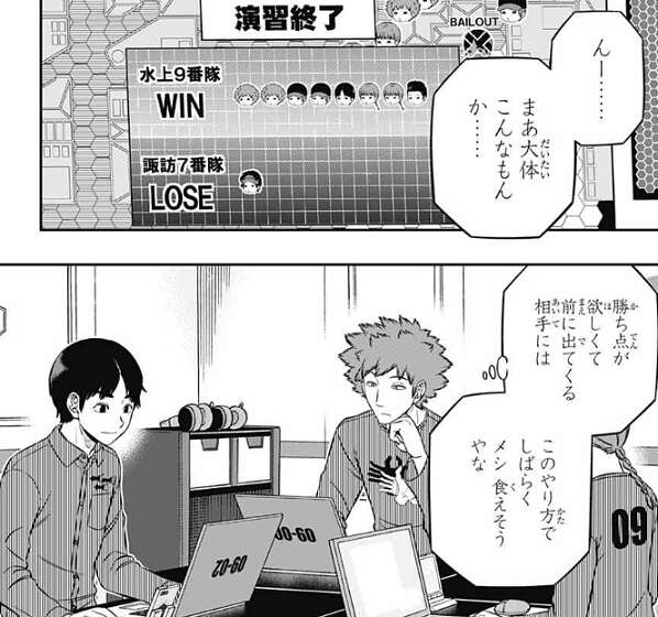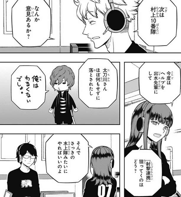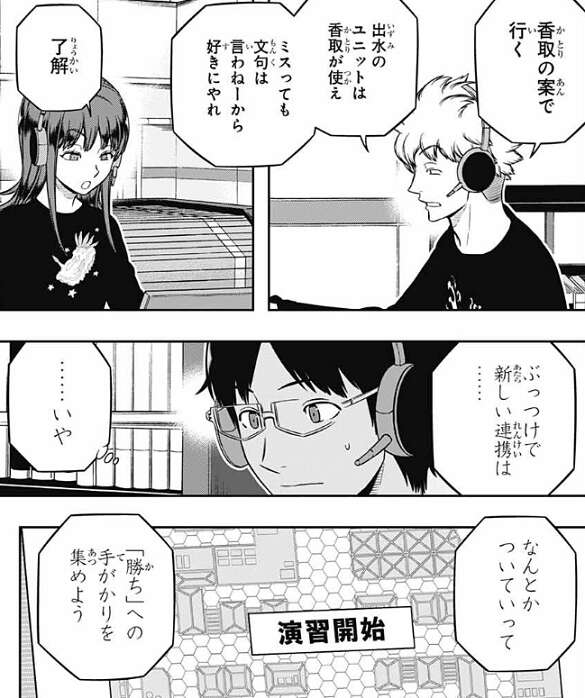 初日の順位で負けている諏訪7番隊は50点取るために攻めなきゃいけない立場だから難しいのでは?と、三雲は意見しますが、香取は「射撃連携」で攻めればいいと答えます。結局、次の時間まで時間がないので諏訪は香取の案を採用し、香取に出水ユニットを操作するように指示します。ぶっつけで新しい連携は……、と三雲は難しいと思いますが、「勝ち」への手がかりを集めよう、と前向きに考えます。