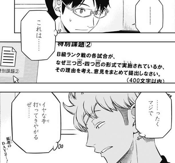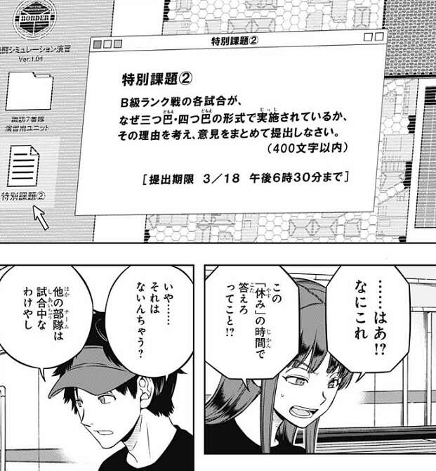 特別課題②が来ていて、諏訪はとりあえず特別課題②を共有に入れます。特別課題②の内容は、B級ランク戦の各試合が、なぜ三つ巴・四つ巴の形式で実施されているか、意見をまとめて提出しなさい、というものです。この「休み」の時間で答えろってこと!?と、香取は文句を言いますが、他のチームは試合中だからそれはないんちゃう?と、隠岐は否定的に言います。