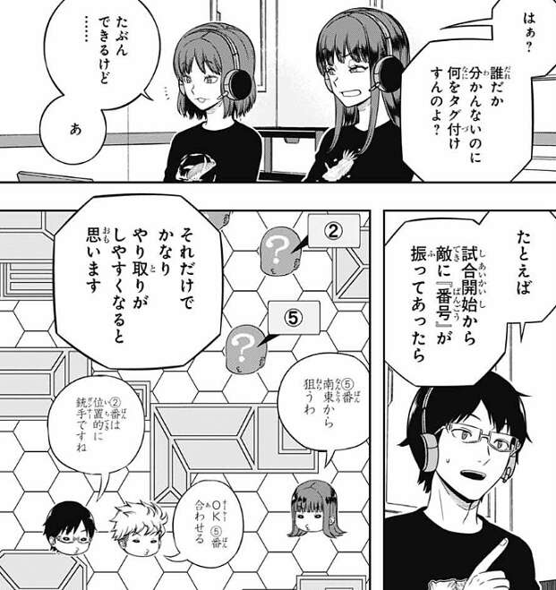 それに対して三雲は、すぐに改善できそうなのはコミュニケーションの食い違いだと言います。香取が三雲に手前のやつ狙ってと伝えても、香取が考える手前のやつと、三雲が考える手前のやつが食い違うので、この辺りの表現をチームで統一しよう、と三雲は意見します。さらに、試合開始から敵ユニットに『番号』を振れば、それだけでかなりやり取りがしやすくなる、と意見を出します。