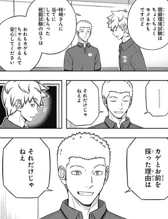 閉鎖環境試験ではちょくちょくモメるかもですけど、柿崎に当てにしてもらった戦闘試験ではちゃんとやるので安心してください、と犬飼は柿崎に対して言いますが、柿崎は影浦と犬飼を採った理由は戦闘試験だけじゃない、と言います。