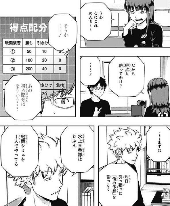 この説明を見た香取は、うわ、なにこれめんど……、だから得点が倍ってわけ?と、つぶやきます。三雲も戦闘シミュ2日目の得点が倍になっている事を思い出し、得点配分の理由に納得します。そして、諏訪は昨日言っていた『俺の予想』を言い、水上9番隊はたぶん戦闘シミュを1人でやっていて、やっているのは荒船か水上のどっちかだろう、という考えを全員に話します。