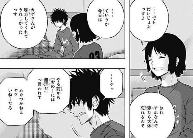 しかし別役は、おれアホなんで寝たら大体忘れるんで、と言った後、今日はカゲさんが味方してくれてうれしかった、と別役は影浦にお礼を言います。影浦は、やる前から『おめーには無理だ』って言われてムカつかねえヤツはいねーだろ、別におめーに限った話じゃない、と言いますが、それでもありがたかったっすよ、と別役は答えます。