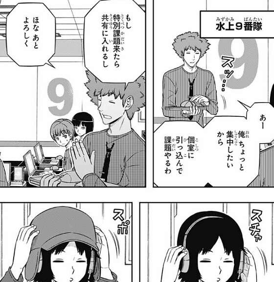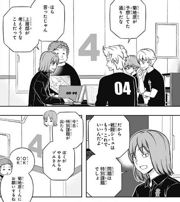 北添4番隊は、菊地原が事前に上層部の考えを予想していたようで、戦闘シミュをどうするかも菊地原が既に考えていたようです。今日特別課題が出たら、菊地原が担当するという事で北添も了解します。