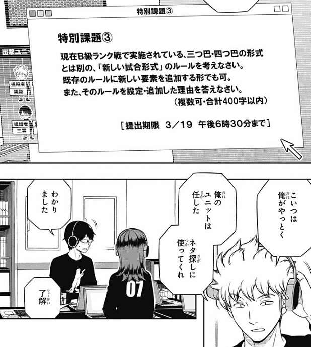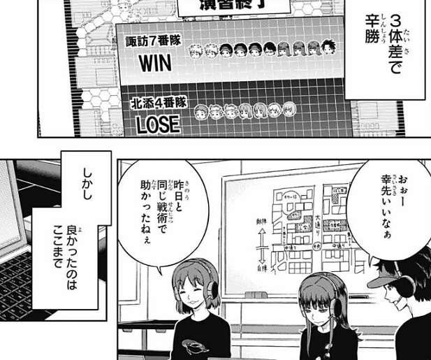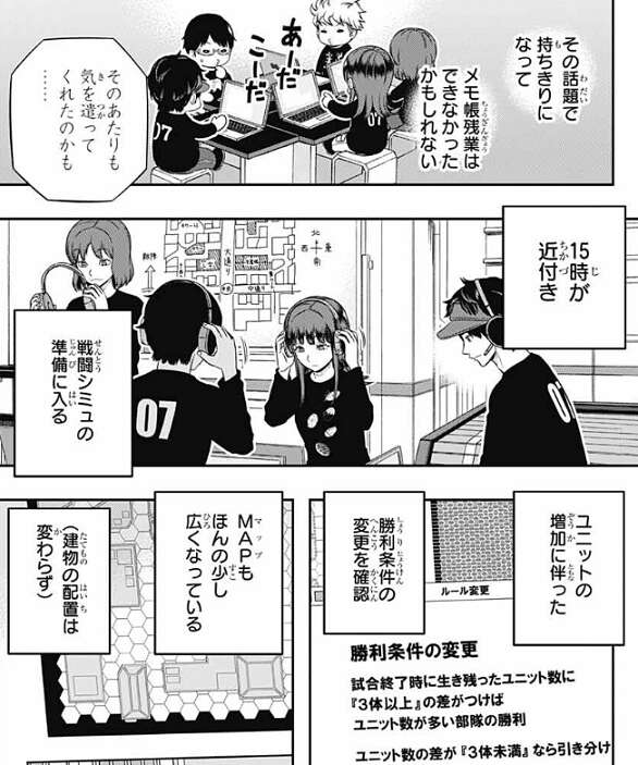 諏訪7番隊は閉鎖環境試験3日目の仕事時間がスタートすると、まずは昨日と同じく共通課題の続きから取りかかります。三雲はメモ帳に解いておいた課題を打ち込みますが、試験2日目の段階で水上隊が1人で戦闘シミュをやっている、と諏訪が言っていたら、その話題で持ちきりとなり、メモ帳に課題を解く残業は出来なかったかも、と三雲は考えます。そして戦闘シミュの時間が近付くと、ユニット増加に伴った勝利条件の変更を確認します。勝利条件はユニット数に『3体以上』の差がつけばユニット数が部隊の勝利となりますが、『3体未満』なら引き分け、と引き分けになりやすい勝利条件になっています。