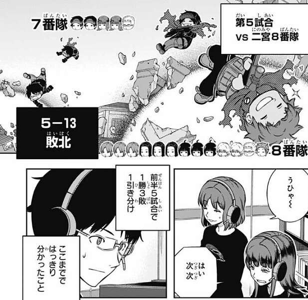 諏訪7番隊は初戦こそ勝利したものの、その後は来馬5番隊には7-10で敗北、水上9番隊には6-12で敗北、村上10番隊には9-11で引き分け、二宮8番隊には5-13で敗北と負けが先行してしまいます。ユニットが増えたことで、強い駒を使った連携が強力になる一方、弱い駒が作る隙や弱点も増えてしまい、かといって弱い駒を敵から逃がすと前線の頭数に差がついて、結局不利になってしまう、という事を三雲ははっきりと分かってきます。諏訪が言っていた通り、ユニットや数字以外の所で差をつけないと、勝ち星が増えない……、と三雲は痛感します。