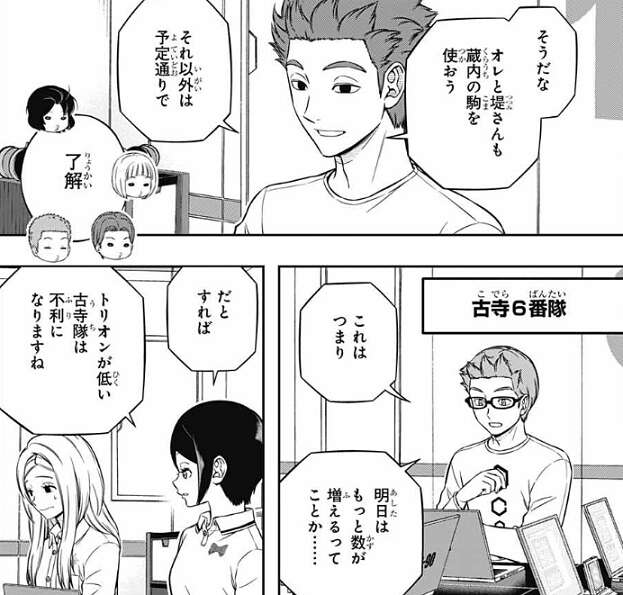 古寺6番隊は、操作するユニットの数が増えればトリオンが低い古寺隊は不利になる、という議論になります。トリオン値の数値がある程度関わってくるシールドや射撃でなく、ブレード主体で戦った方がいい、という話になりますが、古寺はそれでは水上隊に追いつけないし、二宮隊には追い抜かれる、と言います。結局、水上9番隊のメンバー相手に課題の処理速度で追いつくのは難しいので、戦闘シミュで点を稼いで1位を狙うという事になり、戦闘シミュ2日目は明日に繋がるデータを獲るため、色々試すという事で古寺が話をまとめます。しかし、オペレータの六田は何か心配事があるようで一人悩んでいますが、言い出せずそのまま話は進んでしまいます。