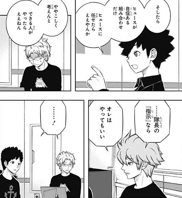 ヒュースは理屈の通った連携で攻めてくる相手、来馬隊、古寺隊、水上隊、村上隊あたりには引き分け以上にできると思う、と言います。理由としては、このチームの明確に有利な点としてほとんどのチームにトリオンの『総量』で優っている所を挙げ、駒の数が増えればその差はさらに広がる、とヒュースは言います。A級駒の使い方にもよるが、『削り合い』で負けにくいのは間違いない、とヒュースがさらにに言うと、それならトリオン量が少ない諏訪隊もいけるんじゃないか?と、笹森が言います。しかし、ヒュースは諏訪隊は香取の動きが読みにくく、余裕勝ちか大負けのどちらかになる相手だ、と答えます。
