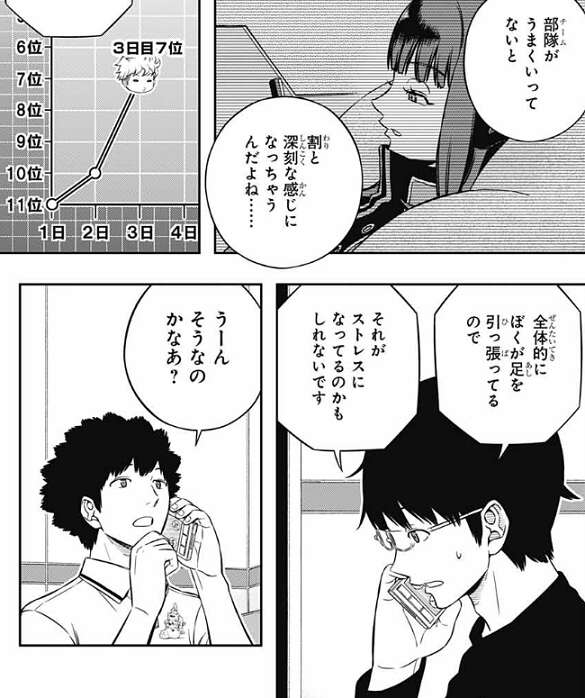 諏訪も、晩メシ当番いけんのか?と、話しかけますが、やはり会話が成立せず、諏訪も会話を諦めます。晩メシ当番は最初、諏訪がやろうとしますが、三雲の課題もかなり追いついてきているという事で、三雲が晩メシ当番を手伝うことになります。一方、若村11番隊の若村は、3日目の順位も最下位という状況に悩んでいました。