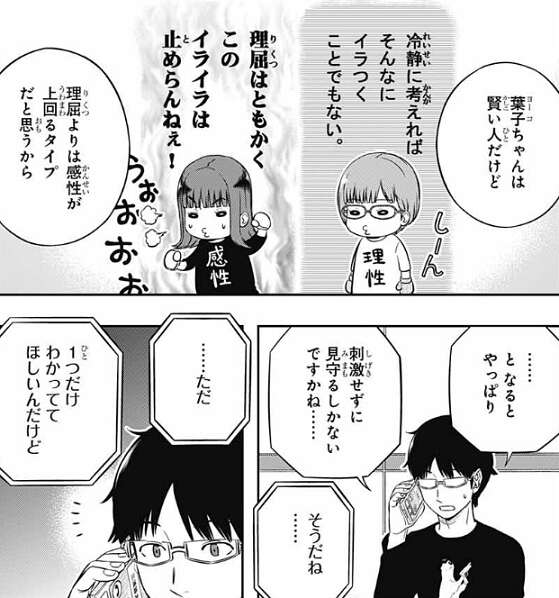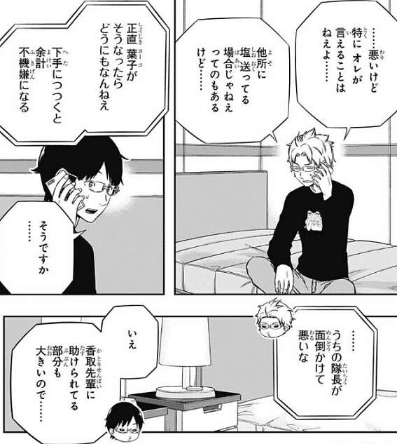 次に三雲は若村に電話をかけますが、若村はため息をしつつも、特にオレに言えることはねえよ……、と三雲に答えるのみでした。香取がそうなったら正直どうにもならない、下手につつくと余計に不機嫌になる、と若村は言い、うちの隊長が面倒かけて悪い、と三雲に謝ります。三雲はヒュースの事を気にしますが、うちの順位が低いのは別にヒュースがトラブってるとかじゃねーから安心してくれ、と若村に言われ、三雲はホッとします。