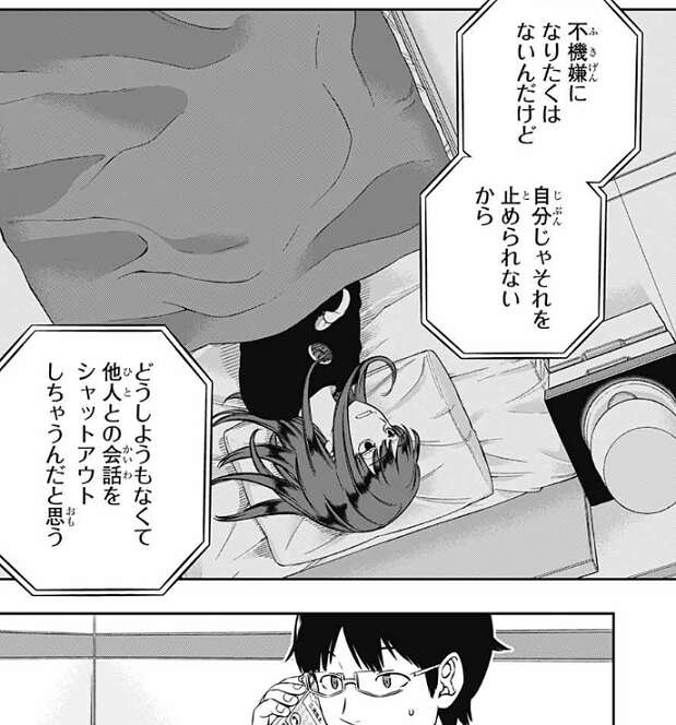 そして、三浦はこれだけは分かって欲しいと言い、香取自身も本当は不機嫌なままでいたいわけじゃないと思う、と三雲に言います。不機嫌になりたくはないんだけど、自分じゃ止められない、だから他人との会話をシャットアウトしちゃうんだと思う、と三浦は言い、不機嫌から意識を逸らせるようなものを、用意できるといいんだよね、と三雲にアドバイスします。