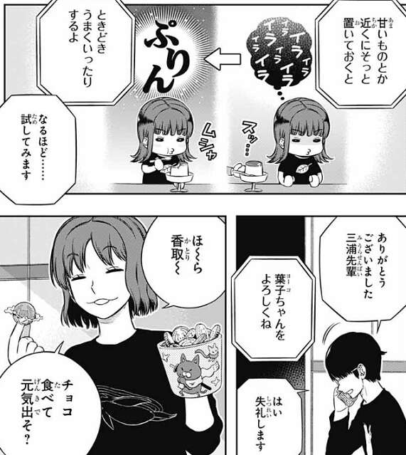 三浦は甘いものを例に挙げて、近くにそっと置いておくと、ときどきうまくいったりするよ、と三雲に言うと、三雲は試してみると三浦に返事をします。そして、宇井は三浦のアドバイスを実行しチョコを香取に見せてみますが、香取はチョコではピクリとも動こうとしません。その様子を見て、諏訪と隠岐は他に香取の気を引きそうなものを考え、烏丸を思いつきます。