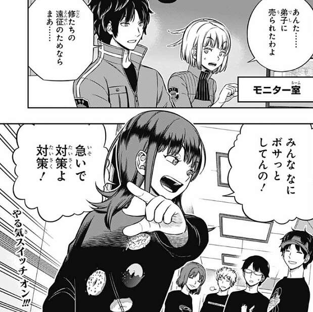 三雲が「はい」と言ったことを確認し、香取は隠岐にも三雲が「はい」と言ったことを確認します。隠岐も、聞いてもうたなぁ、と答えるしかない状況です。モニタールームで香取達の様子を見ていた小南は、あんた……弟子に売られたわよ、とあきれますが、修たちの遠征のためならまあ……、と烏丸は三雲の役に立つならと、三雲が勝手にデートの許可を出したことを許します。やる気が復活した香取は、なにボサっとしてんの!急いで対策よ、対策!と、7番隊のみんなに率先して声を掛けます。
