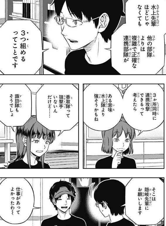 それを聞き諏訪が、諏訪7番隊の中に、諏訪隊の諏訪、香取隊の香取、玉狛第2の三雲で3つの『ミニ水上隊』を作る、という三雲の結論を代弁します。
