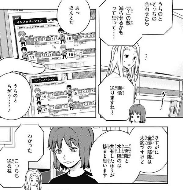すると宇井が、んじゃ訊いとこ、と対戦相手の能力データで虫食いになっている所を開示し合おうと言います。全部のチームは大変ですが、上位チームの二宮隊と水上隊の能力データは共有したほうが捗ると思う、という事になり宇井と六田はお互いのデータを送り合います。さらに香取が持っている万能適正スキルの情報も交換します。適正系スキルはどれも微妙だと香取は言い、万能適正スキルも雑魚スキルだと、香取は断言します。