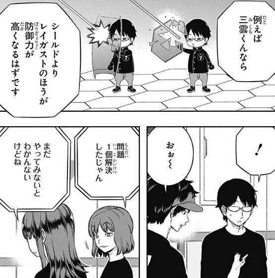 6番隊は射撃トリガーより刃(ブレード)トリガーの方が、トリオンが低くても威力が出る事を知っていて、それを古寺は7番隊に教えます。三雲の場合ならシールドよりレイガストで守った方が、防御力が高くなるようです。やってみないと分かりませんが、三雲が狙われてもすぐやられてしまい囮として機能していない、と言っていた問題も解決しそうです。