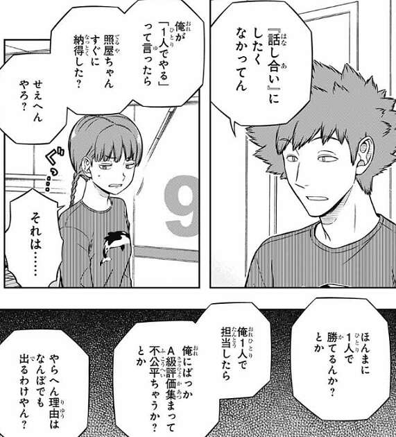 一方、諏訪7番隊の三雲は共通課題で一つ、思いついたことがあるようで、諏訪にその話をしようとします。しかし、ルール的に有りか、無しか、が三雲には分からないようで、迷っている様子を見せます。