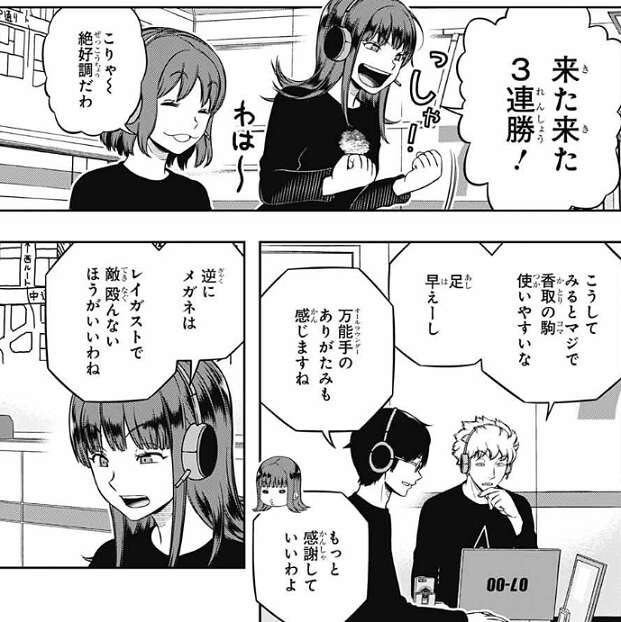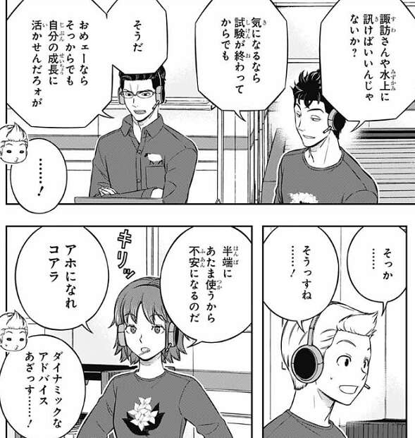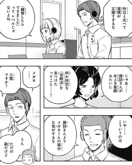 昨日と比べて連携が正確すぎるな、と蔵内が言い、『練習したらできました』ってレベルじゃないよね、と氷見も練習によるレベルじゃないと言います。堤は、諏訪隊の連携の向上に三雲が絡んでいる事を勘で当てています。