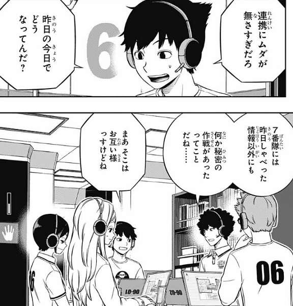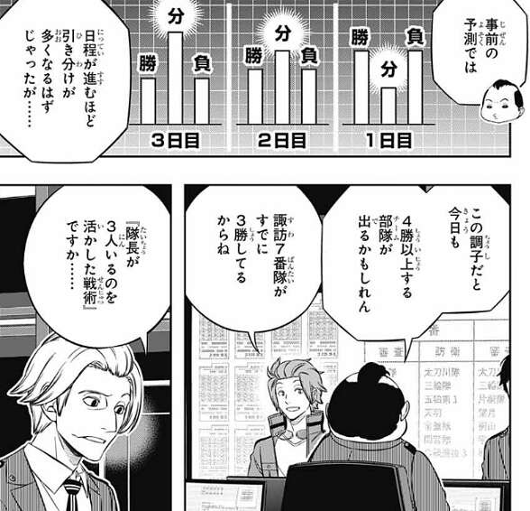 一方、運営本部デスクでは、各チームの戦闘シミュの様子を審査しています。運営本部デスクでは、日程が進むほど引き分けが多くなると事前に予測していたようですが、諏訪7番隊のように既に3勝しているチームもあり、予測より勝ち負けに偏りが出ているようです。諏訪7番隊が『隊長が3人いるのを活かした戦術』で3勝し成果を出したので、唐沢が似たような事を言っていた、と根付がつぶやきます。