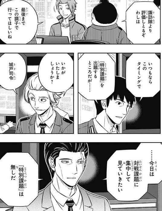 鬼怒田は『隊員の負担が小さい策』で成果を上げている、北添4番隊や王子2番隊を諏訪7番隊より評価しているようです。いつもならこのタイミングで『特別課題』を出す所ですが、今回は対戦課題に集中して見ていきたい、と城戸が言った事もあり『特別課題』は無しになります。