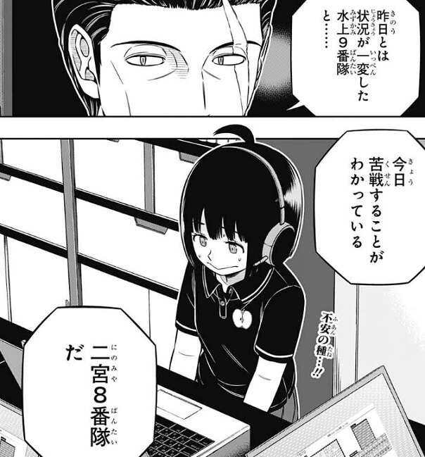 そして、今日の試合どのあたりに注目してるの?と、迅が城戸に聞くと、昨日と状況が一変した水上9番隊と、今日苦戦することがわかっている二宮8番隊をあげます。苦戦することがわかっている二宮隊の所で、雨取のカットが出ていましたが、雨取に何かあったのでしょうか?