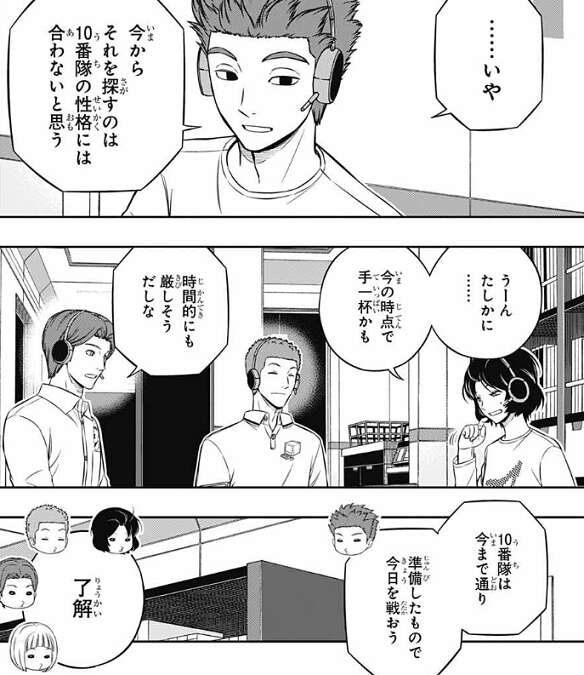 氷見は水上隊や諏訪隊が使っている『特別な攻略法』を探すべきか?と、村上に聞きますが、村上は、今からそれを探すのはうちの正確には合わないと思う、と言い『特別な攻略法』を探して使う事には否定的な意見を出します。他のメンバーも同じような意見で、村上隊は今後も今まで通り準備したもので戦う事にします。