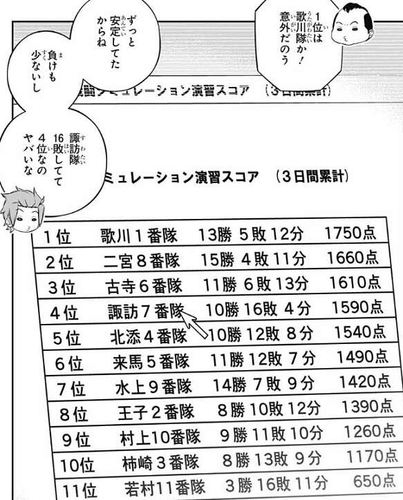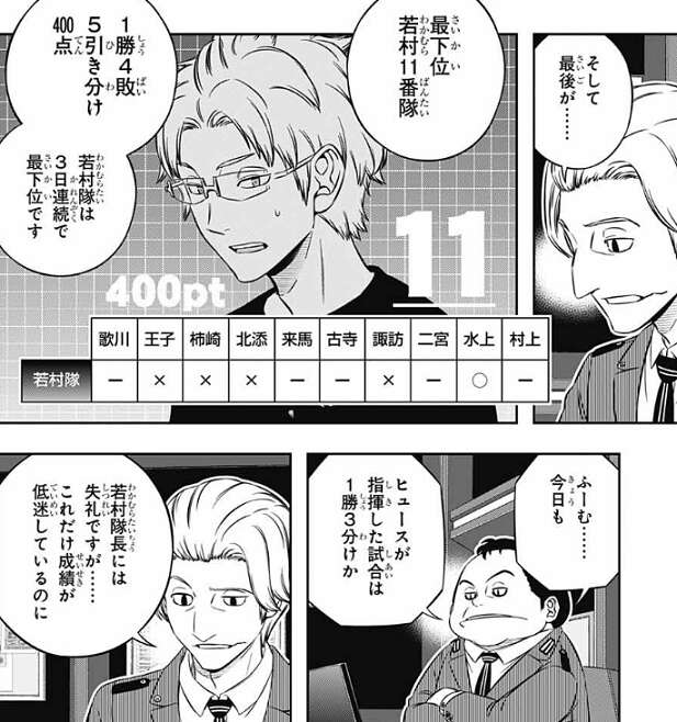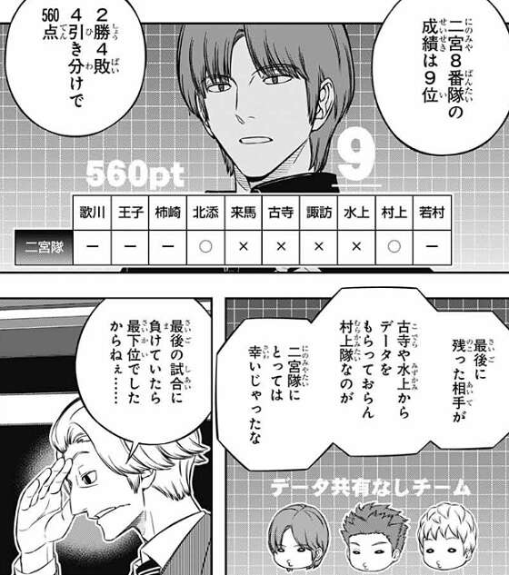 二宮8番隊の成績を見ると、9位で2勝4敗4引き分け、560点でした。最後に残った村上隊は古寺や水上から二宮隊のデータを貰ってなかったのも幸いしたようですが、雨取が最後の試合の前に元気を取り戻し自分の意見を言っていましたが、最後の試合は無事勝利したようです。もし最後の試合、あのまま負けていたら二宮隊は最下位だったそうです。二宮隊は前日1位だったので順位が最下位まで落ちると、特に雨取の精神的ダメージは大きかっただろう、と忍田や迅が話しています。