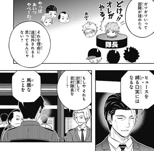鬼怒田は、ヒュースは遠征にガイドとして同行できると高をくくって、試験の成績にはこだわらんつもりなのかのう、と推測しますが、迅は、どっちかというとガツガツいってチームが揉めたら遠征を外されると思ってるかも?と、推測します。ヒュースを縛る口実にはなるな、と城戸はつぶやきますが、もしやそれも計算して若村隊長を……?と、根付が邪推します。しかし、若村を臨時隊長に選出したのは、ボーダーという組織の将来を考えた上でのことだ、と忍田はハッキリ断言します。根付も、でしょうな これは失言でした、と忍田に謝罪します。