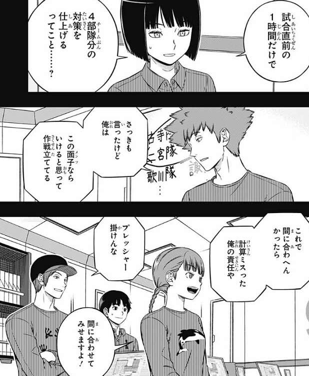 この試験は最終的に分担課題の進み具合で勝負がつくと水上は考えていて、ギリギリまで分担課題をやりつつ、戦闘シミュはピンポイントで対策する、と水上は隊員に説明します。試合直前の1時間だけで4チーム分の対策を仕上げるのでかなりハードルは高く、思った通りハードルが高いと分かり今は難しそうな顔をしますが、水上はこのメンツならいけると思って作戦を立ててる、と隊員に言います。これで間に合わへんかったら、計算ミスったオレの責任や、と水上は言いますが、照屋は、間に合わせてみせますよ!と、自信を見せます。荒船は、プレッシャー掛けんな、とツッコミを入れますが、照屋と同じく自信はありそうです。