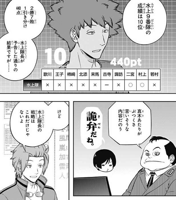 こうして戦闘シミュ前の説明が終わり場面は運営本部デスクへ戻り、水上9番隊の成績は10位で2勝7敗1引き分け、440点でした。水上の予告した通り2勝していますが、真木辺りが、詭弁だね、と言いそうな内容だ、と鬼怒田がつぶやいています。しかし、水上の戦略は上位4チームに絞った対策だけでなく、前の日に下位の何チームかに宛てて上位チームのユニット情報を流していたそうです。隊員に無茶な要求をする一方で、別のルートからも手を打っていた、と城戸は評価しているようです。こういう人材がいると楽なのではないのかね?と、城戸が忍田に質問しますが、時と場合による、渋い顔で答えます。どうやら林藤の事が頭をよぎったようです。