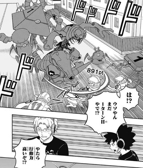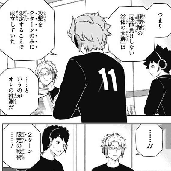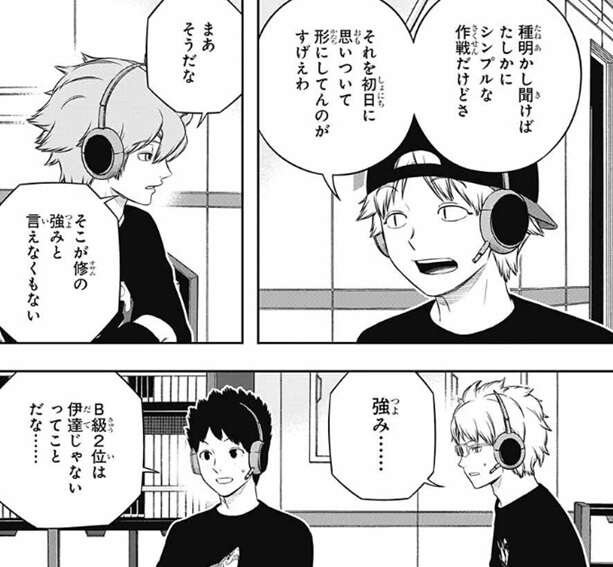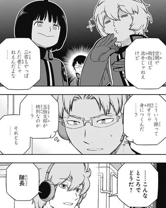 半崎は三雲がこの作戦をマジで考えてんの?とヒュースに聞き、ヒュースがこの推測が当たっていればの話だがなと答えると、これを初日に思いついて形にしてんのがすげえわ、と三雲に驚きます。そこが修の強みといえなくもない、とヒュースが答えると、B級2位は伊達じゃないってことだな……、と笹森も三雲の発想力に驚きます。
