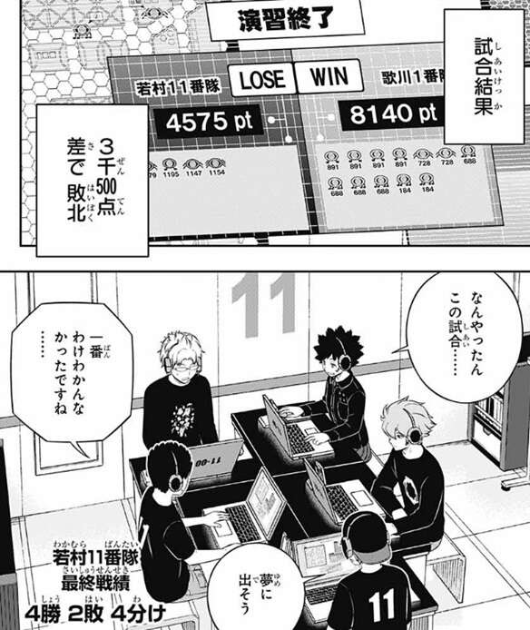 歌川隊の相手を惑わせるアイデアが反映された、見た目が謎のユニットが大量に出てきて、若村隊は歌川隊の狙い通り見た目の情報に振り回され、結果歌川隊の速攻が簡単に通りました。確かに『対策しない』と事前に決めていないと、どうしても歌川隊のユニットの見た目を無視出来ず、意識があちこちに飛んでしまい試合に集中できないと思います。これは空閑のアイデアの勝利ですね。第241話、242話を見ると諏訪隊と歌川隊も成績は良さそうですが、若村隊の5日目の順位は何位でしょうか?