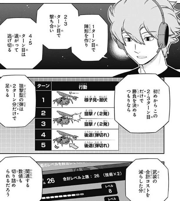1ターン目で陣形を作り、2・3ターン目で撃ち合い、4・5ターン目で退がって逃げ切る、とヒュースは諏訪隊の作戦を説明し、初めから2・3ターン目だけで勝負を決めるつもりなら、狙撃型の弾は2ターン分だけで足りる、とヒュースは言います。さらに武装の合計コストを減らした分、関連するパラメータも切り詰められると、ヒュースは付け加えます。