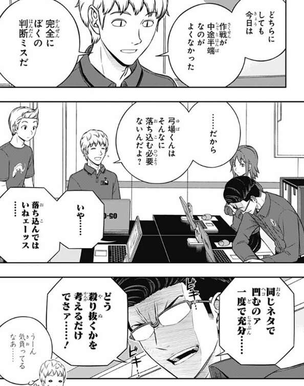 場面は来馬5番隊に移り、全体的に対応型のチームが苦戦していると来馬が分析しています。来馬隊も対応型の戦術の為に成績が振るわず、総合順位を8位に落としていて、単日11位、特殊シミュ11位と苦戦しています。来馬は作戦が中途半端なのが良くなく、隊長のぼくの判断ミスだと言い、弓場にそんなに落ち込む必要はないとフォローします。弓場は落ち込んでいないと言いつつ、トリオン兵の作り方について色々教えてくれた小荒井に申し訳ないと謝ります。しかし、小荒井は全然大丈夫だと言い、戦闘では弓場さんがチームを助けてくれるっしょ?と、弓場を元気づけます。