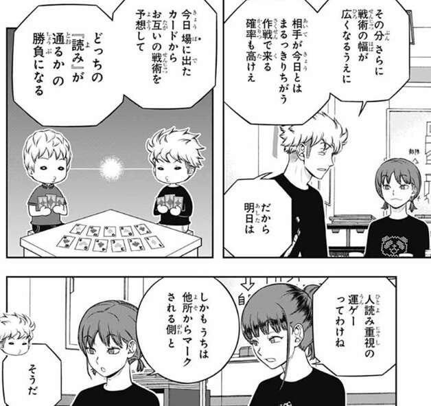 諏訪は理由として昨日、今日とシミュでバカ勝ちしているからと言い、どういう状況か分かるか?とメンバーに聞きますが、三雲が戦闘シミュの初めの頃の水上隊と二宮隊を例に出します。水上隊と二宮隊は戦闘シミュで初めの頃バカ勝ちしましたが、目立ってしまい対策をされて勝ちにくくなり、成績を落としました。諏訪は諏訪隊も総合2位まで上がって目立ってきたので、対策されるのは当たり前と言います。香取は、だったら今日は作戦を隠しておいて配点が高い2日目に作戦を使い、がっぽり得点を取ればよかったと言います。しかし、使えるユニットが決まっている戦闘シミュと違って特殊シミュは自由度が高いと諏訪は言い、三雲もどこかのチームが今日諏訪隊と同じ作戦をやってくる可能性がそこそこあったと言います。